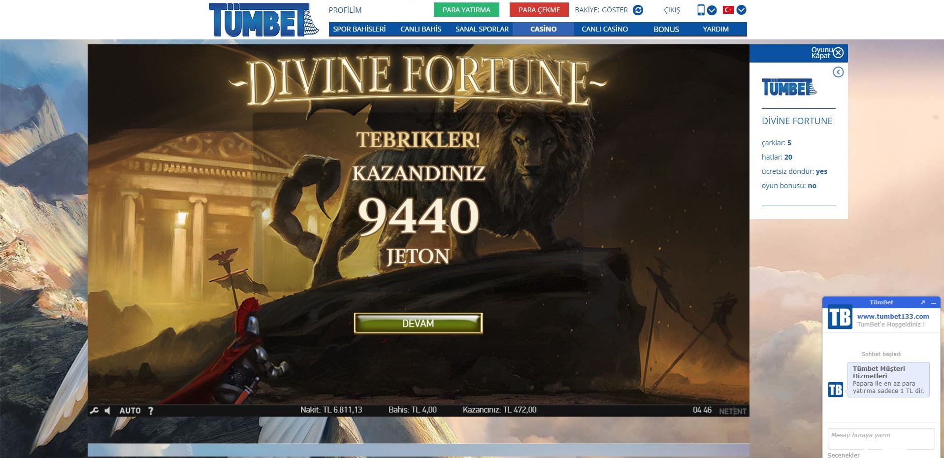 Uzun zamandır slot oyunlarına ara vermiştim , Netent’in yüksek jackpot ödülü olan Divine Fortune oyununda tekrar başladım , bi kaç gündür oynuyorum papara ile para yatırıp 400 lira ile başladımdı 30-35 defa 80 TL olan minor jackpot’u 6-7 defa 400 TL olan major jackpot aldım hedefim mega jackpot olduğu için devam ediyorum kasam 7 bin küsürlerde şuanda umarım mega jackpot ödülü olan 780 bin TL yi alınca da paylaşım yapabilirim sizlere.. Tümbet casino oyunları slot oyunları iyi ödüyor gerçekten tavsiye ederim..